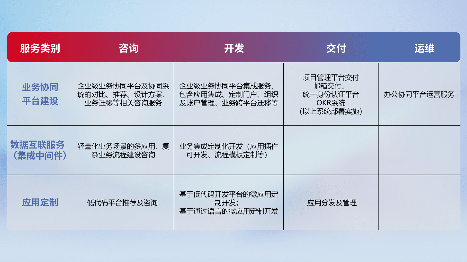 针对钉钉、、、、企微、、IDaas等平台级产品提供产品的规划、、、、方案、、交付、、定制化开发等服务,,实现如统一协同办公、、、、智能客户服务、、、混合会议管理、、、智能数据查询、、等业务场景,,,实现数字化转型。。